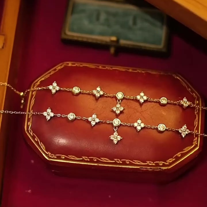 Wrap your wrist in radiant elegance with the Circle of Luck Clover Bracelet. Featuring sparkling moissanite stones set within delicate circular frames and clover motifs, this piece symbolizes love, faith, hope, and fortune.