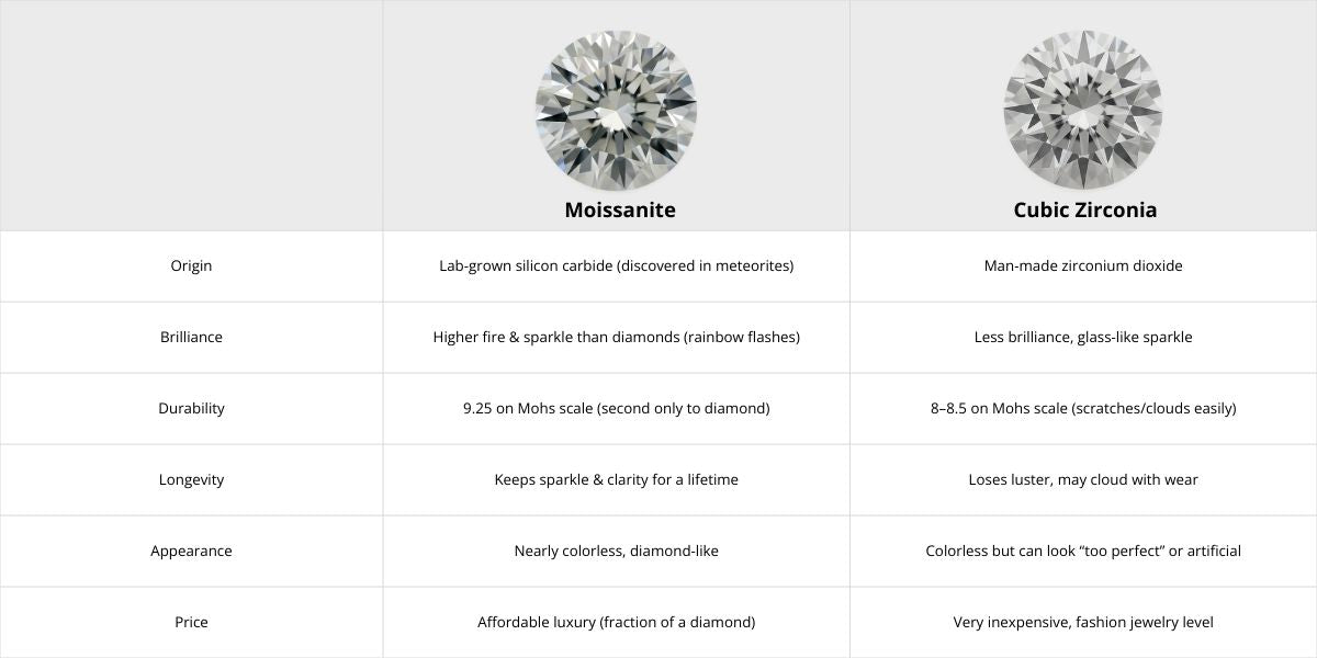 Moissanite is far superior to cubic zirconia in brilliance, durability, and longevity. While CZ is inexpensive, it scratches easily and clouds over time. Moissanite, on the other hand, is nearly as hard as diamond, keeps its sparkle forever, and looks much closer to a real diamond.